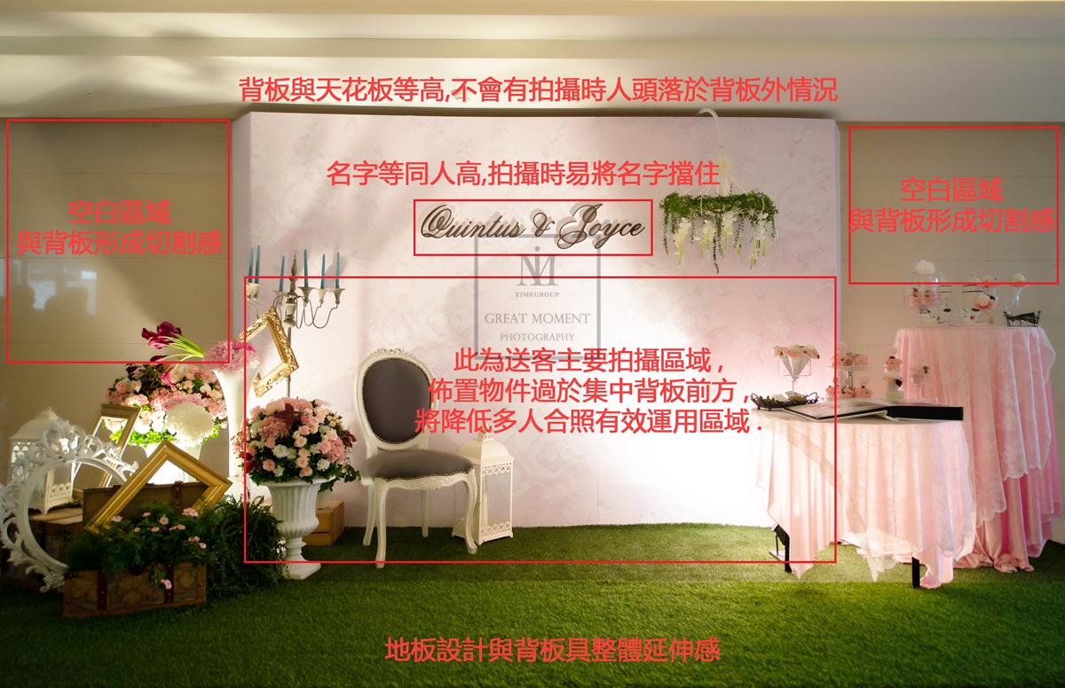 2. 依送客定位及賓客人數設計背板寬度以便區隔出拍攝區域,避免大合照時部分賓客落於背板之外,或是合照背景雜亂的情況。